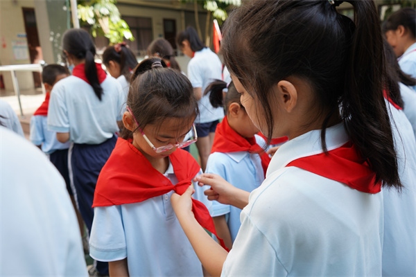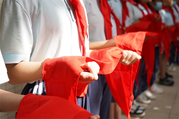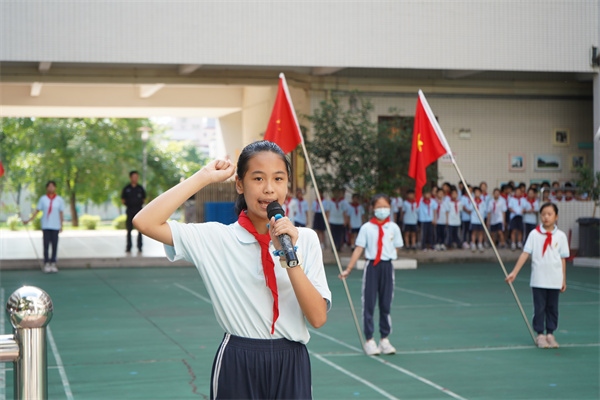 隨后,大隊輔導(dǎo)員羅錦老師宣讀組建一年級新少先隊中隊組織的決定,宣布新入隊的隊員名單并向他們表示祝賀。六年級的隊員們傳遞著紅領(lǐng)巾和隊徽,逐一為新隊員們佩戴上。新老隊員互敬隊禮,寓意著星星火炬,代代相傳。從這一刻起,新隊員便成為少先隊的一員。那一抹紅是驕傲的,是嚴(yán)肅的,更是充滿期待的。面向鮮艷的大隊旗,全體隊員右手握拳,舉在耳側(cè),莊嚴(yán)宣誓,堅定而響亮的聲音響遍校園的每一個角落。錚錚誓詞,是少先隊員們的心聲,是對黨、對祖國、對人民最響亮的回答。