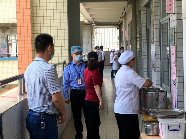 兩位監(jiān)督員在學(xué)校行政的陪同下,進(jìn)行實(shí)地和資料相結(jié)合查驗(yàn),主要對(duì)食品經(jīng)營(yíng)許可證、信息公示、“明廚亮灶”規(guī)范建設(shè)、食品安全制度管理、從業(yè)人員管理、環(huán)境衛(wèi)生管理、原料控制等方面進(jìn)行了檢查。正值午餐時(shí)間,檢查人員深入到課室,檢查了防控期間學(xué)生的用餐情況。