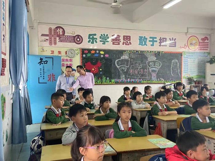 賴老師首先聽取了羅校長就學?!半p減”“五項管理”工作情況的匯報。接著,賴老師通過查閱資料、現(xiàn)場考察等形式對學校“雙減”“五項管理”工作進行全面了解與檢查,先后來到教學樓、勞動教育基地、運動場等場所進行實地考察,重點詢問了學校的教育教學、安全防疫、學生心理健康教育、體育鍛煉等工作的開展情況。最后,賴老師深入課堂,采用推門聽課、走訪座談、問卷調查等形式對學校的教學和班級管理進行督導檢查。