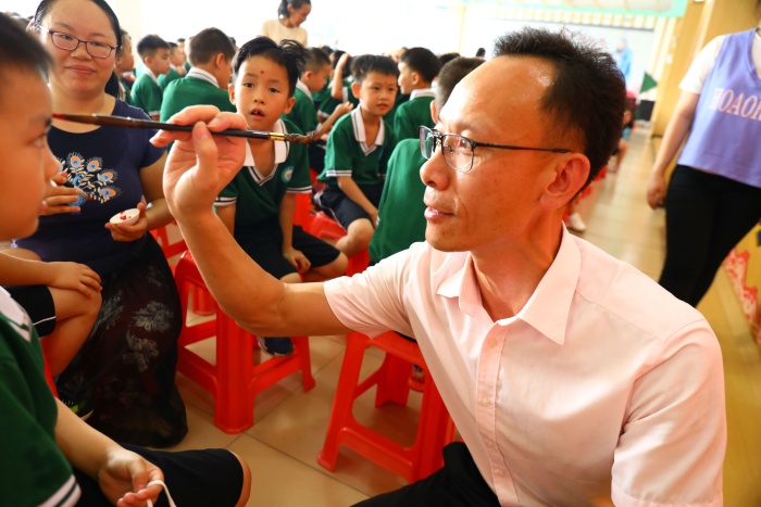 “先正衣冠,后明事理?!币荒昙壭律硪鹿诤笙蛉w師生行拜師禮;接著,老師們?yōu)樾律c(diǎn)朱砂,祝福孩子從此眼明心明,好讀書、讀好書。一年級教師發(fā)言,帶領(lǐng)孩子們開啟小學(xué)的“秘密花園”,新生代表發(fā)言,暢想童稚的向往。黃炎有副校長帶領(lǐng)一年級的孩子們進(jìn)行入學(xué)宣誓,立志爭做“樂學(xué)善思,敢于擔(dān)當(dāng)”的好少年。
