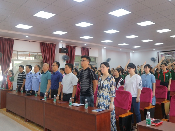 本次活動(dòng)共四個(gè)環(huán)節(jié)。首先,阮麗霞主任主持會(huì)議,帶領(lǐng)全校師生舉行簡(jiǎn)單而不失莊重的升旗儀式;接下來(lái)由法制副校長(zhǎng)盧日文警官做假期安全專(zhuān)題講話,盧警官借用廣告語(yǔ)“道路千萬(wàn)條,安全第一條”,著重強(qiáng)調(diào)了假期“人身安全、居家安全、出行安全”的重要性,強(qiáng)調(diào)把安全變成習(xí)慣,鑄就平安愉快的假期。