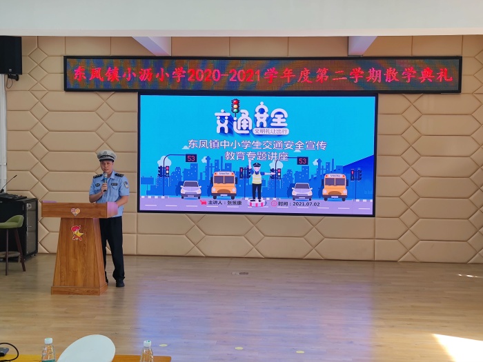 散學(xué)典禮由小瀝小學(xué)陳名勝主任主持,共有四個(gè)議程,分別是法制安全教育、交通安全教育、小瀝小學(xué)黎三妹副校長作學(xué)校工作總結(jié)以及師生頒獎(jiǎng)儀式。首先由小瀝小學(xué)法制副校長梁凎榮警官為全體師生作了非常詳盡的暑假法制安全教育。梁警官從疫情防控、防溺水、用電安全、防詐騙等方面展開教育,重點(diǎn)強(qiáng)調(diào)暑假防疫,非必要不離粵不離市,確保安全健康返校。接著由東鳳鎮(zhèn)交通安全宣講員張景康警官為師生們作了交通安全教育。張警官從行走安全、乘車安全、騎車安全等方面提醒師生遵守交通法規(guī),注意人身安全。