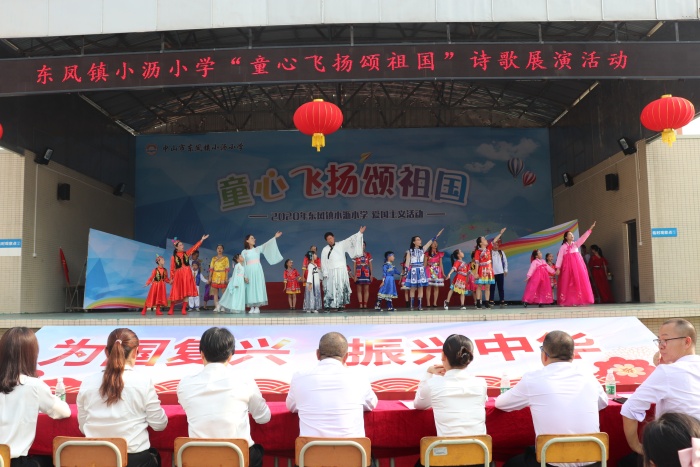 據(jù)悉,本次展演活動,該校的節(jié)目編排匠心獨(dú)運(yùn):一、二年級以演唱“童謠”的形式歌頌祖國;三、四年級以朗誦“愛國詩篇”的形式贊美祖國;五、六年級以表演“古典詩詞”的形式禮獻(xiàn)祖國。舞臺上,家長與學(xué)生個(gè)個(gè)精神抖擻,深情地傳誦著祖國的經(jīng)典詩歌。親子攜手,演繹著祖國從積貧積弱的曾經(jīng)到今天不斷壯大的歷程!一年級的《盧溝謠》,稚嫩童音唱出危難下中國人民的團(tuán)結(jié)奮進(jìn)。二年級的童謠《中國》訴說著對祖國深深的情意。三、四年級分別帶來的朗誦《厲害了,我的國》和《月光下的中國》,帶領(lǐng)聽眾領(lǐng)略了詩意中國的美!五年級典雅的《江南》與六年級豪邁的《誦經(jīng)典,展新輝》交相輝映,炫麗的舞姿與深情的詩歌誦讀,展現(xiàn)了中國悠久的歷史文化底蘊(yùn)。學(xué)生展演節(jié)目一樣精彩不斷:一年級的《祖國祖國我們愛你》與二年級的《娃哈哈》,在學(xué)生的一笑一顰中,把學(xué)生的天真可愛演繹得淋漓盡致!三、四年級帶來的朗誦《我驕傲,我是中國人》和《我和我的祖國》,讓愛國之根再次深扎每一個(gè)孩子心坎!五年級《詩詞知識歌》與《少年中國說》順推節(jié)目走向高潮,訴說著“少年強(qiáng)則國強(qiáng)”過往與現(xiàn)今的呼聲,道出了小瀝學(xué)子“為國復(fù)興,振興中華”的心聲!