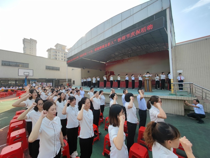 9月9日早上,小瀝小學(xué)全體師生在操場(chǎng)舉行了莊嚴(yán)而又隆重的教師節(jié)慶祝活動(dòng)。在莊嚴(yán)的升旗儀式過后,高強(qiáng)輝校長在致辭中贊美了老師們無私奉獻(xiàn)、默默耕耘的育人精神,向辛勤工作的教師們表達(dá)謝意,并送上了節(jié)日的問候。同時(shí),高校長希望同學(xué)們刻苦努力,努力做最好的自己,不辜負(fù)老師們的辛勤付出。接著,豐富多彩的文藝節(jié)目更是把整個(gè)慶?;顒?dòng)推向高潮。孩子們精彩的民樂演奏《萬疆》、舞蹈表演《小戲迷》表達(dá)了對(duì)老師的感恩。新教師代表用誦讀傳達(dá)自己對(duì)教師這份事業(yè)的熱愛,贏得了孩子全場(chǎng)的熱烈掌聲。最后,黎三妹副校長帶領(lǐng)全體教師面向國旗莊嚴(yán)宣誓。
