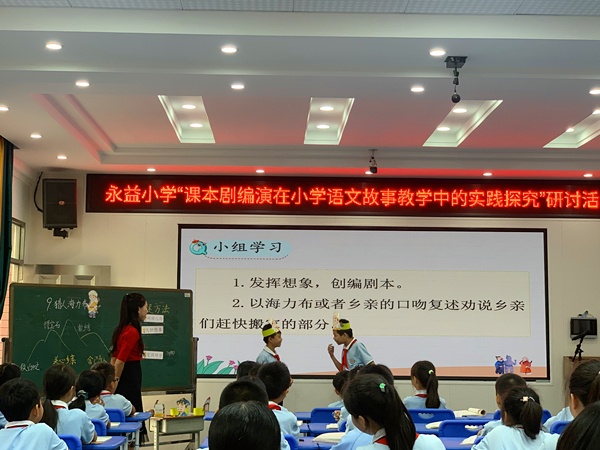 而鄧老師執(zhí)教的則為五年級上冊的民間故事《獵人海力布》。鄧老師緊扣單元主題,學生在老師的引導調動下,能在理解全文、把握人物特點的基礎上讓學生創(chuàng)造性地復述故事,并用課本劇形式分享給大家,教學氛圍輕松愉快。