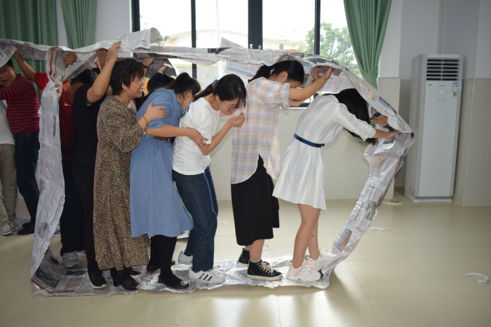 本次活動(dòng)內(nèi)容豐富,形式多樣,趣味十足。王雅老師先是營(yíng)造了在荒島求生大背景,然后帶領(lǐng)教師們進(jìn)行三輪體驗(yàn)式活動(dòng):第一輪是建立互助逃生小組,教師們自由組建7人小組,選出隊(duì)長(zhǎng),大伙一起商量編隊(duì)名、唱隊(duì)歌,接著進(jìn)行2分鐘團(tuán)隊(duì)士氣展示;第二輪是尋寶大作戰(zhàn),尋找逃出荒島的物資:6只襪子、一副眼鏡、兩個(gè)水壺、兩對(duì)鞋、一個(gè)包,比一比哪一組用時(shí)最短;第三輪是無(wú)敵風(fēng)火輪,每小組利用報(bào)紙和膠帶制作一個(gè)可以容納全體團(tuán)隊(duì)成員的封閉式大圓環(huán),將圓環(huán)立起來(lái)全隊(duì)成員站到圓環(huán)上邊上行走,滾動(dòng)大圓環(huán)最快的為最終贏家。三輪活動(dòng)總分前三名的小組勝出。每一輪活動(dòng)結(jié)束后,王雅老師都會(huì)組織教師們進(jìn)行5分鐘的反思分享,思考在這個(gè)環(huán)節(jié)中小組成員或自己為什么這么快或這么慢完成任務(wù)?贏了或輸了的原因是什么?下一次個(gè)人或團(tuán)隊(duì)如何才能做到最好?教師們?cè)诜窒憝h(huán)節(jié)能積極發(fā)言,結(jié)合自己的切身體會(huì)分享了自己的所見(jiàn)所聞、所思所想,得到了老師們的一致好評(píng)。