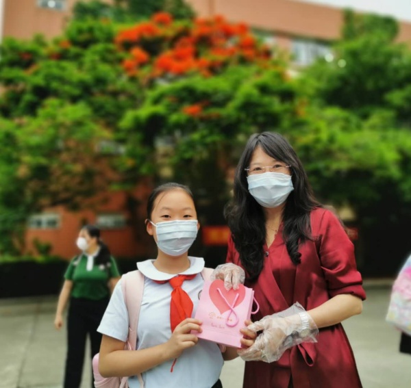 朗晴小學鄭鳳姚校長帶領行政團隊早早等候在校門口,為學生派發(fā)精美的開學禮物。禮物袋上的愛心圖案飽含著全體教師新學期的殷殷祝福,笑臉宣泄球、笑臉筆記本、笑臉章、棒棒糖、心情卡,每一樣禮物都是為學生的身心健康精心設計、挑選。學生們喜氣洋洋接過禮物,精神抖擻走向課室。