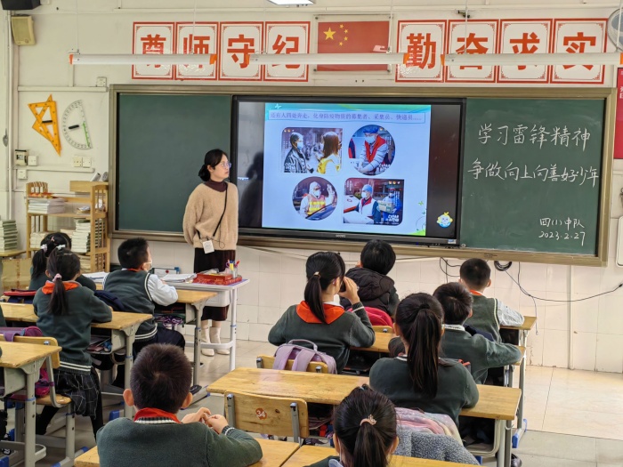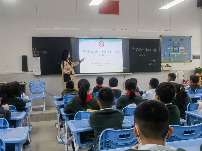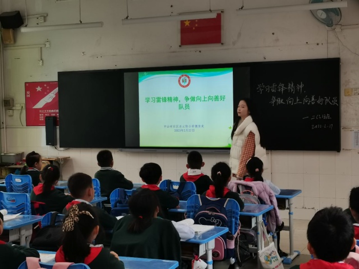 升旗儀式上,五9中隊的隊員做以“學(xué)雷鋒”為主題的國旗下演講。他在演講中回顧雷鋒的感人事跡,號召隊員們向雷鋒學(xué)習(xí),團結(jié)友愛,樂于奉獻,從現(xiàn)在做起,從小事做起,為建設(shè)美好社會貢獻自己的力量。接著各中隊開展“軒小少年說”的活動,說得是雷鋒故事,學(xué)得是新時代雷鋒精神。隊員繪聲繪色地講述著一個個生動的紅色故事。主題隊會課伊始,輔導(dǎo)員們通過講述“雷鋒是誰”讓隊員對雷鋒有了全面的了解,知道雷鋒曾是飽受苦難的苦孩子、熱愛勞動的奉獻者、熱愛學(xué)習(xí)的求知者、刻苦鉆研的“螺絲釘”、助人為樂的志愿者。緊接著,輔導(dǎo)員結(jié)合PPT及富有感染力的視頻,向隊員們展示現(xiàn)實生活中的“活雷鋒”事跡,帶領(lǐng)隊員領(lǐng)悟愛國奉獻、助人為樂、勤儉節(jié)約、艱苦奮斗等雷鋒精神,引導(dǎo)隊員在生活中盡己所能、熱心助人;努力學(xué)習(xí),認真做事。尾聲,隊員們齊唱《學(xué)習(xí)雷鋒好榜樣》,他們用嘹亮的歌聲致敬身邊的活雷鋒,激勵自己爭當(dāng)活雷鋒,做新時代雷鋒精神的傳承人。