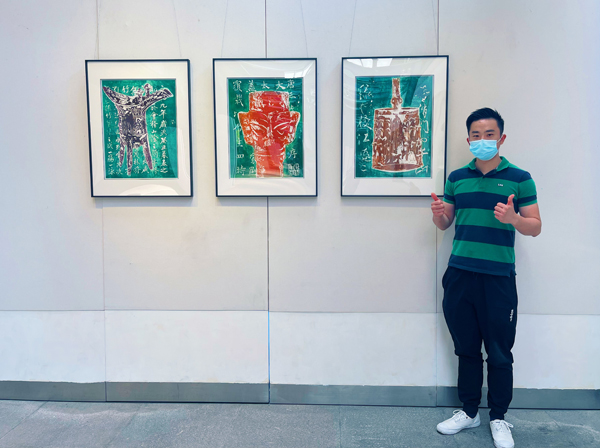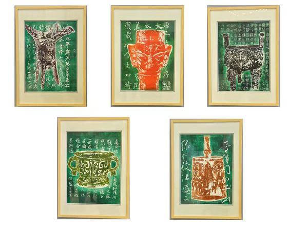 施恒老師結(jié)合古代不同年代青銅器與不同書法體作為創(chuàng)作題材,以5幅不同題材畫作為系列作品,通過(guò)古代時(shí)間軸排序,用木刻版畫方式進(jìn)行藝術(shù)創(chuàng)作,在選送中的多幅版畫作品中脫穎而出并展覽。