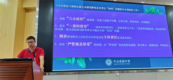 會(huì)上,蔡昌盛同志帶領(lǐng)全體教職工學(xué)習(xí)了《關(guān)于在全市開展黨員干部和公職人員酒駕醉駕及其背后“四風(fēng)”問題專項(xiàng)整治的工作方案》。同時(shí),對(duì)個(gè)別黨員干部、教師“八小時(shí)以外”違紀(jì)違法典型案例的通報(bào)進(jìn)行了再學(xué)習(xí),為全體教職工明確了糾“四風(fēng)”和酒駕醉駕重點(diǎn)工作及相關(guān)要求。要求全體教職員工提高思想認(rèn)知,端正工作態(tài)度,堅(jiān)決杜絕頂風(fēng)違紀(jì)行為,進(jìn)一步積極營(yíng)造風(fēng)清氣正的工作氛圍。同時(shí),對(duì)全體教職工提出倡議,希望大家提高思想覺悟,守住生活警戒線,帶頭遵守法律法規(guī)、黨紀(jì)黨規(guī)、社會(huì)公德。自覺主動(dòng)減少應(yīng)酬,把時(shí)間和精力用在干事創(chuàng)業(yè)和陪伴家人上,樹立公私分明、尚簡(jiǎn)戒奢、文明健康的新風(fēng)正氣。
