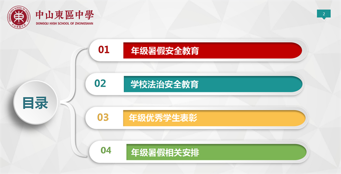會議分成四個部分,首先,年級進行暑假安全教育工作,戰(zhàn)“疫”尚未結束,疫情防控仍不能大意,不去人群密集的地方,出門做好防護;交通安全,遵守交通規(guī)則,文明出行;防溺水安全,不獨自或約同學到池塘、河流、水庫、湖泊等地方游玩,牢記防溺水“六不準”;手機已經(jīng)成為學生手邊必備的通訊工具,黃主任提醒學生要注意網(wǎng)絡安全。第二部分,對家長及學生進行法治教育工作,讓學生意識到做一名遵紀守法的公民的重要性。希望學生在日后遇到法律問題時,也能通過法律手段維護自身的合法權益。第三部分,針對本學期表現(xiàn)優(yōu)秀的學生進行表彰,黃主任對獲獎同學提出表揚,并且號召其他同學向優(yōu)秀的同學學習。第四部分,對于暑假的相關工作進行布置,希望同學們度過一個充實而有意義的假期生活。