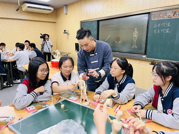 “咚…咚咚…咚咚咚”,施恒老師以鼓奏樂,以家鄉(xiāng)閩南非遺文化說唱片段導(dǎo)入課堂,并運用多元式對話場景開展教學(xué)活動,通過“魔法”技術(shù)的設(shè)疑,引導(dǎo)學(xué)生跟隨線索識別擊鼓說唱俑獨特的面部特征,通過人偶關(guān)節(jié)定點的擺動,學(xué)生化身工匠人,感受不同姿態(tài)動作帶來的傳神趣味體驗。課堂的最后,施恒老師以說明介紹文字標(biāo)簽為導(dǎo)引,牽引學(xué)生用精簡的文字了解不同姿態(tài)的說唱俑形象并準(zhǔn)確識別擺放說唱俑正確位置,通過本節(jié)課,讓學(xué)生感受漢代說唱藝人的樂天與自由。