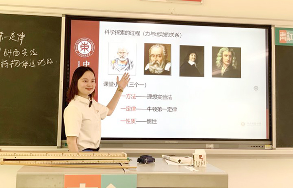 曾老師本次參賽課題為《牛頓第一定律》。課堂上,曾老師先以一個神奇的小魔術(shù)“橘子爬桿”導(dǎo)入新課,激發(fā)學(xué)生的學(xué)習(xí)興趣;緊接著通過兩個演示實(shí)驗引導(dǎo)學(xué)生觀察,啟發(fā)學(xué)生思考“力與運(yùn)動”的關(guān)系。其次,曾老師引入了歷史上物理學(xué)家們對“力與運(yùn)動”的研究歷程,得出牛頓第一定律,加深了學(xué)生對“力與運(yùn)動”這一重點(diǎn)知識的理解。最后,曾老師應(yīng)用幾個視頻展示,幫助學(xué)生理解“慣性的利用及防止”這一難點(diǎn)知識。課后專家評委對該節(jié)課進(jìn)行了詳細(xì)到位的評價,肯定了曾老師流暢的教學(xué)設(shè)計和良好的課堂氛圍,提示教師注意引導(dǎo)學(xué)生總結(jié)概念和鞏固練習(xí)。