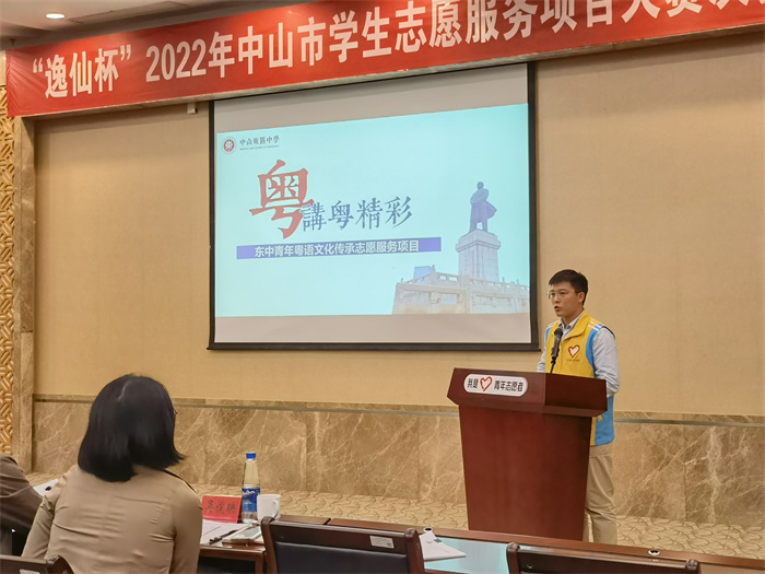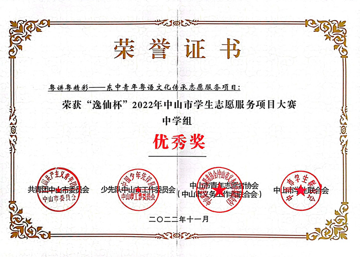 2022年11月,“粵講粵精彩”——東中青年粵語文化傳承志愿服務(wù)項目成功入圍2022年“逸仙杯”中山市學(xué)生志愿服務(wù)項目大賽的決賽,并獲評優(yōu)秀獎。