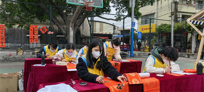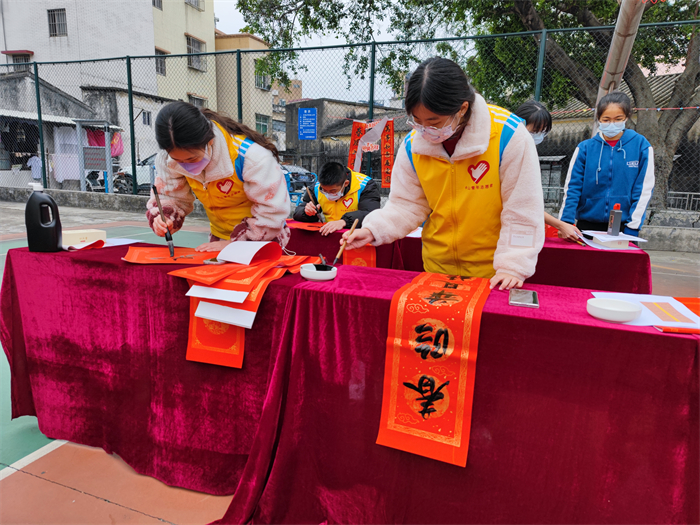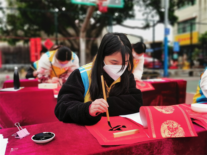 無聯(lián)不成春,有聯(lián)春更濃。在農(nóng)歷新春來臨之際,為進(jìn)一步提高喜慶祥和的節(jié)日氣氛,讓社區(qū)居民切實感受到年味,2023年1月17日,中山市東區(qū)中學(xué)校團(tuán)委聯(lián)合桃苑社區(qū),組織學(xué)生開展“青春情暖,揮春到家”活動。中山市東區(qū)中學(xué)高三年級書法生積極參與了本次活動。