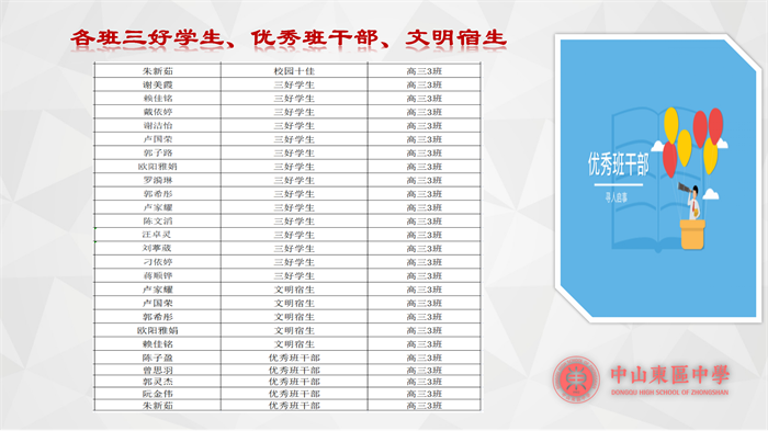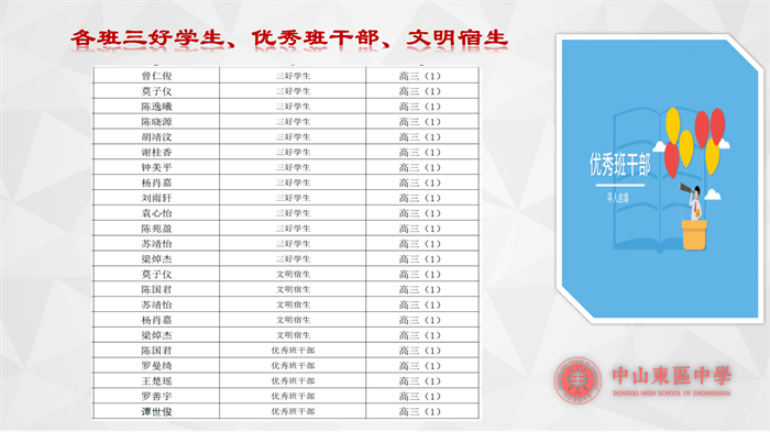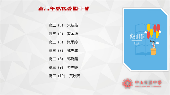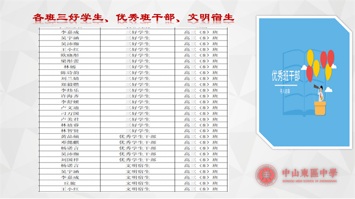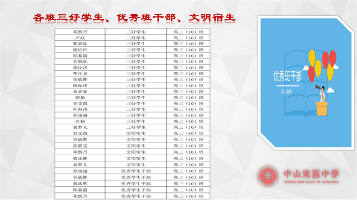 第三,針對本學(xué)期表現(xiàn)優(yōu)秀的學(xué)生進行表彰,黃主任對獲獎同學(xué)提出表揚,并且號召其他同學(xué)向優(yōu)秀的同學(xué)學(xué)習(xí)。