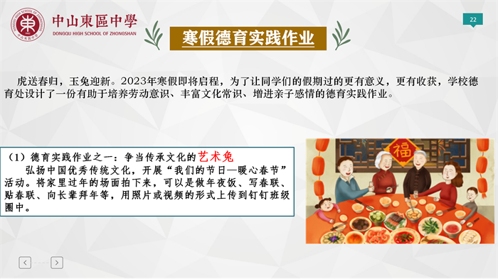 第四,對于寒假作業(yè)進行布置,要主動、自覺、自律的安排好每天的計劃表,有效率、有效果的完成各科作業(yè)。為了讓寒假過得更有意義,更有收獲,學(xué)校德育處設(shè)計了一份有助于培養(yǎng)學(xué)生勞動意識、豐富文化常識、增進親子感情的德育實踐作業(yè),希望同學(xué)們度過一個充實而有意義的假期生活。