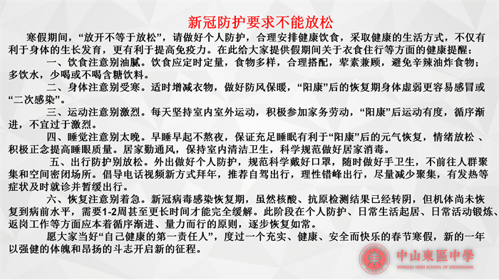 第二,黃天濤主任強調(diào)新冠防護要求不能放松,放開不等于放松,請各位同學(xué)做好個人防護,合理安排健康飲食,保持健康的生活方式。希望大家做好自己健康的第一責(zé)任人,度過一個充實、健康、快樂的寒假,新的一年以強健的體魄開啟新征程。