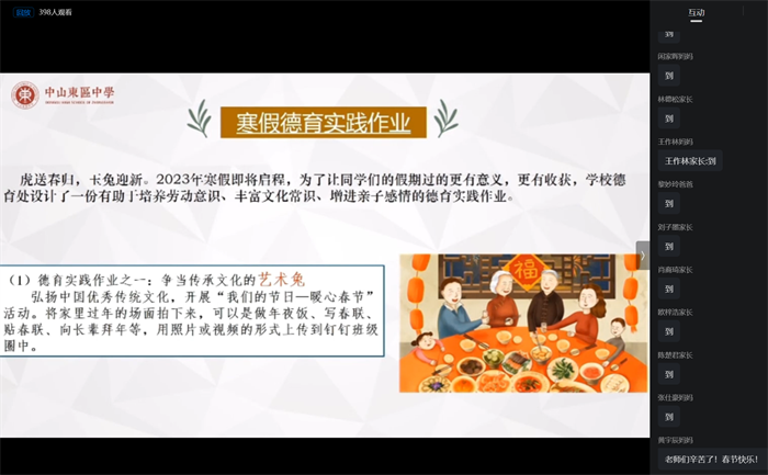 寒冬料峭期末至,碩果滿懷假期來。伴隨著歲月匆匆的腳步,承載著勤奮耕耘的喜悅,圓滿結(jié)束了一學期緊張而又充實的學習生活。我們迎來了期盼已久的寒假,為了給這個特殊而又充實的學期畫上圓滿的句號,更好地引導(dǎo)學生安全、充實、有意義地度過寒假生活。1月13日晚上,東區(qū)中學高二全體師生相聚釘釘家長群,舉行了2022-2023學年上學期線上散學典禮,本次散學禮由高二年級錢逢勝主任主持。