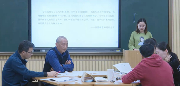 首先分享的是紀天舒老師。她圍繞書中“騾子拉車”的例子,結(jié)合自身教學中遇到的教學難點,與老師們共享了如何巧妙地化解牛頓第三定律中相互作用力不能抵消的難題。接下來分享的是鄺榮榮老師,他從《36天,我的美國教育之旅》等書籍中學會的不僅僅是教育教學專業(yè)方面的理論知識,更是向在座年輕教師傳達了“沒有最好,只有更好”的追求精神,這種精神體現(xiàn)在教師應不斷地反思,促進專業(yè)追求、專業(yè)探索和專業(yè)提升。申志勇老師的分享中提到了“每個現(xiàn)象的背后都有一個深層次的知識構(gòu)架”,這是物理學科的特點,就像3D電影背后是光的偏振原理,人能走路是摩擦力的貢獻等等。緊接著陳金藝老師提到了書中物理學史的發(fā)展過程,這不禁使人想到世人對亞里士多德的誤解,年少時錯誤的認為他愚蠢至極,到后來讀了一些有關(guān)物理學史的書籍后才發(fā)現(xiàn)亞里士多德的思想偉大。一句話,物理推動了科技的進步,科技也推動了物理的發(fā)展。王賢燕老師在分享伊始就提出了“讀書使人明智”的思想,強調(diào)物理學習注意知識的遷移,而這種遷移的本領(lǐng)也是脫離學科本身的一種解決問題的技能。許敏萱老師則與大家分享了如何利用書籍中的例子,結(jié)合學生的喜好,選擇“學生喜歡的例子”,而不是“老師喜歡的例子”,進而更好地提升課堂參與度。最后分享的是曾馨璇老師,她的讀后感的關(guān)鍵詞是學生“與生俱來的好奇心”,教師一方面要保護學生的好奇心,另一方面要指引學生思考、分析有趣的現(xiàn)象背后蘊含的物理知識。