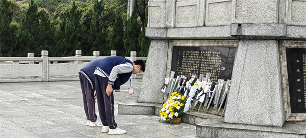 活動(dòng)的第一站,同學(xué)們一同來(lái)到了中山革命烈士陵園,此處安放有從第一次國(guó)內(nèi)革命戰(zhàn)爭(zhēng)、抗日戰(zhàn)爭(zhēng)、解放戰(zhàn)爭(zhēng)、抗美援朝到社會(huì)主義建設(shè)時(shí)期前赴后繼、英勇?tīng)奚?010位烈士中的324具革命烈士的遺骨或骨灰,供后人瞻仰。站在烈士紀(jì)念碑前,同學(xué)們神情莊重、肅穆,活動(dòng)在黃綽彥同學(xué)主持下開(kāi)始。第二期青馬班班委朱新茹同學(xué)與蕭政霖同學(xué)代表同學(xué)們,向烈士們獻(xiàn)上花圈。隨后,同學(xué)們現(xiàn)場(chǎng)默哀1分鐘后,兩兩一組朝向烈士紀(jì)念碑方向鞠躬致意,以表達(dá)對(duì)革命先烈的緬懷與敬意。