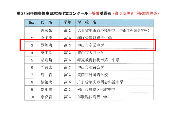近日,由中國青少年研究中心和日本青少年研究所共同舉辦的第27屆全國高中生日語作文競賽獲獎名單揭曉。我校高三7班羅婉清同學在全國106所學校的368名參賽選手中脫穎而出,榮獲全國一等獎;張賽珍老師榮獲優(yōu)秀指導教師獎。