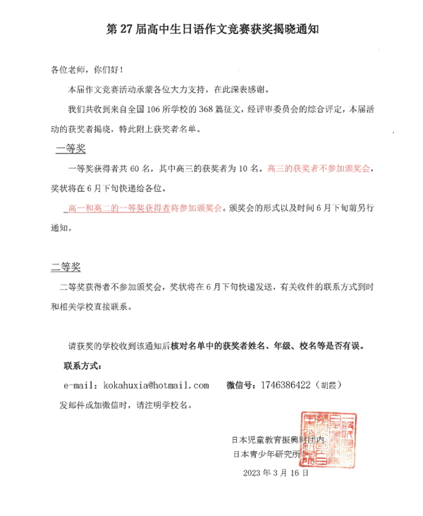 全國高中生日語作文競賽由中日兩國青少年研究中心主辦,每屆比賽都有全國20多個省市開設日語課程的上百所中學積極組織參加,參賽學校和人數(shù)眾多,競賽影響力大,已成為國內(nèi)高中生日語比賽的頂級賽事之一。