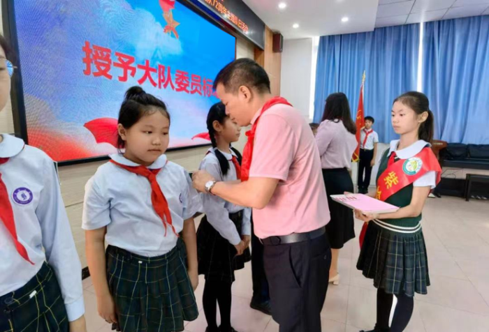 隨后,少工委主任何建明、副主任湯玨敏為新一屆學(xué)校大隊(duì)委員授予大隊(duì)委標(biāo)志?!罢堻h放心,強(qiáng)國有我”慷慨激昂的誓言在校園回響,展現(xiàn)了少先隊(duì)員奮發(fā)向上、追求進(jìn)步的精神風(fēng)貌。他們將努力學(xué)習(xí),為實(shí)現(xiàn)中華民族偉大復(fù)興的中國夢貢獻(xiàn)自己的力量!