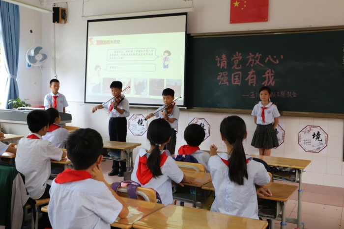 “請黨放心,強(qiáng)國有我”主題隊(duì)會。隊(duì)會課上,輔導(dǎo)員們從不同的視角,用少年兒童喜聞樂見的方式,以更具時代感和創(chuàng)新性的形式,設(shè)計(jì)了“黨的百年征程”、“我們的錚錚誓言”、“我們的美好未來”等豐富多樣的內(nèi)容。以播放和講解習(xí)近平總書記“七一”重要講話精神相關(guān)內(nèi)容,圍繞“強(qiáng)國有我”這一話題展開討論,引導(dǎo)隊(duì)員們學(xué)習(xí)黨史故事,了解黨的發(fā)展歷程和精神力量。少先隊(duì)員還用小提琴、街舞、唱紅色經(jīng)典歌曲、詩朗誦等多種方式表達(dá)對黨和祖國的熱愛之情和對美好未來的期盼。在一個個環(huán)節(jié)中,隊(duì)員們重新認(rèn)識了黨的奮斗之路,在心中埋下了理想的種子,先輩們熊熊燃燒的信仰之火照耀著隊(duì)員們未來的征程。