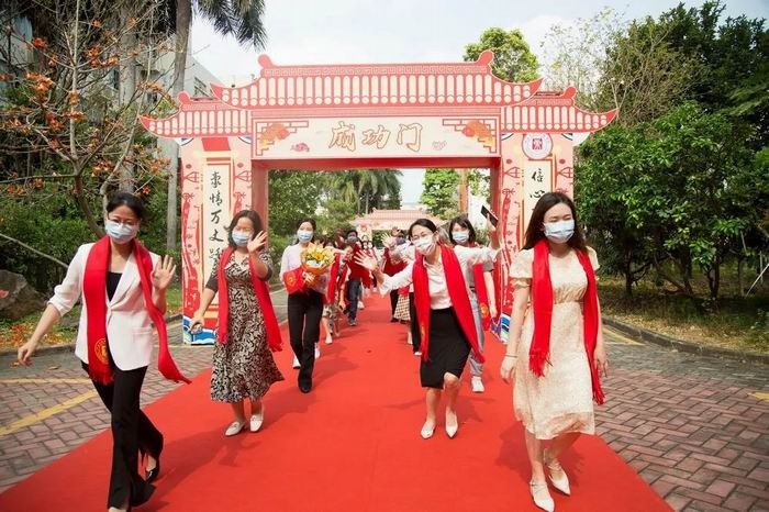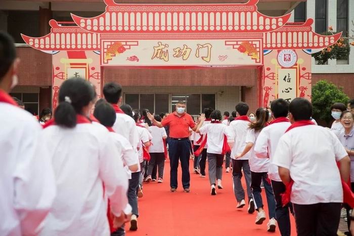 下午兩點(diǎn)四十分,高三學(xué)子整肅在學(xué)校廣場(chǎng),分班依次穿過“成人門”,走上紅地毯。全體高三老師列隊(duì)兩側(cè),雙手為剛剛跨過成人門檻的學(xué)子們披上紅色圍巾,歡送他們穿越“成功門”,登上“十八歲成人禮暨高考動(dòng)員大會(huì)”的主會(huì)場(chǎng)。