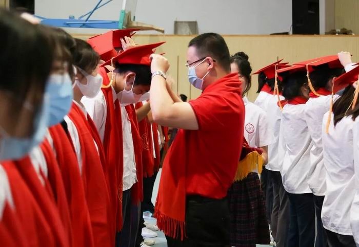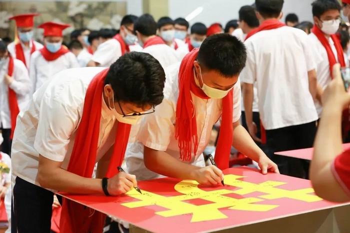 周錦泉校長(zhǎng),張旭副校長(zhǎng)帶領(lǐng)班主任為學(xué)生佩戴成人帽、頒發(fā)《中華人民共和國(guó)憲法》讀本。成人是一種超越生命時(shí)間尺度的責(zé)任與擔(dān)當(dāng)。頭戴成人帽,手捧《憲法》,這一刻他們已是肩負(fù)責(zé)任與使命的成人了,寓意著同學(xué)們要以共和國(guó)公民的身份去承擔(dān)起法律賦予的權(quán)利和義務(wù)!同學(xué)們要用一往無前的勇氣去面對(duì)高考,面對(duì)未來的人生。