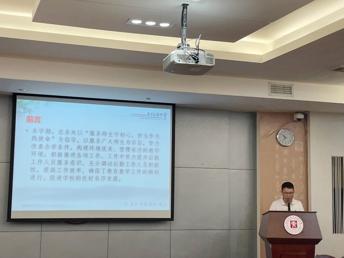 楊安明主任從財(cái)務(wù)工作、日常維修、安全工作、食堂工作、物業(yè)工作、疫情防控、節(jié)能環(huán)保等方面對(duì)學(xué)校2021學(xué)年下學(xué)期的后勤工作進(jìn)行了總結(jié)回顧。