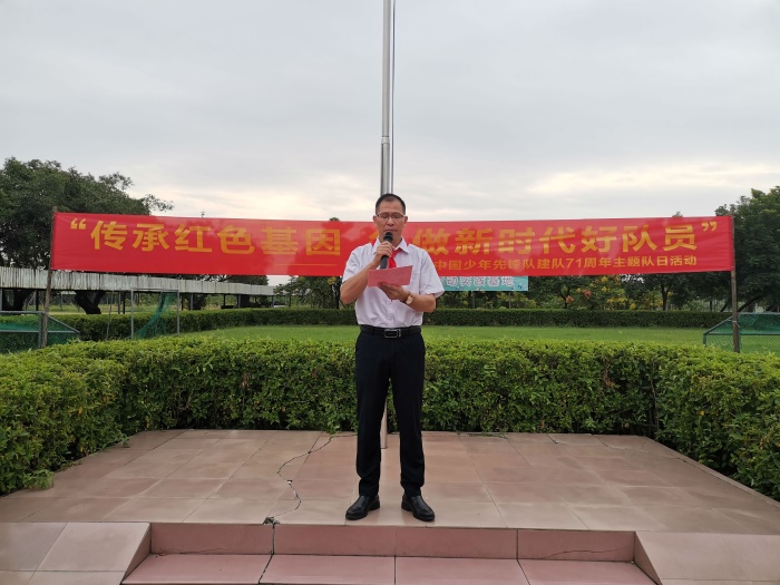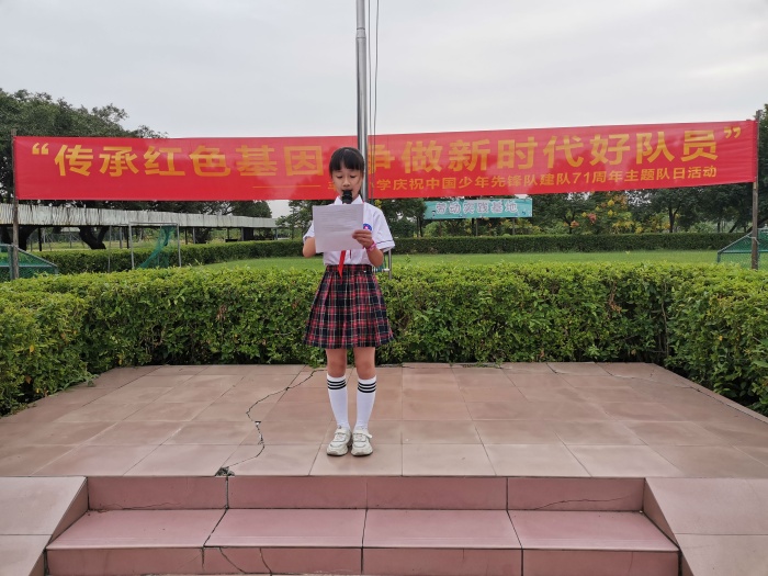 隨后,豐聯(lián)小學(xué)五(1)中隊(duì)許思齡同學(xué)作為隊(duì)員代表在隊(duì)旗下進(jìn)行了題為《時(shí)刻準(zhǔn)備著》的演講,還帶領(lǐng)著隊(duì)員們重溫了入隊(duì)誓詞。而后,豐聯(lián)小學(xué)少工委主任詹前秒向全體隊(duì)員們致辭。他希望豐聯(lián)小學(xué)全體學(xué)子們能時(shí)刻以少先隊(duì)員的標(biāo)準(zhǔn)嚴(yán)格要求自己,也希望豐聯(lián)小學(xué)各輔導(dǎo)員們把愛心獻(xiàn)給隊(duì)員,把智慧獻(xiàn)給紅領(lǐng)巾事業(yè),做少先隊(duì)員最親密的良師益友,期待少先隊(duì)員們與輔導(dǎo)員們能共同開創(chuàng)豐聯(lián)小學(xué)少先隊(duì)工作的新局面。