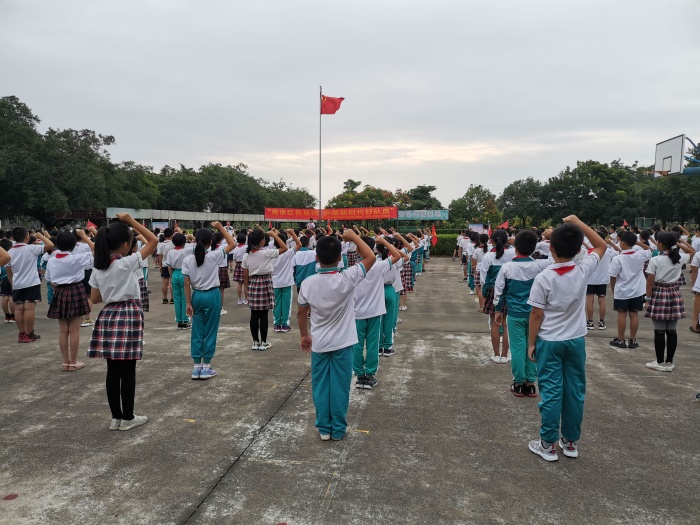 10月13日一早,豐聯(lián)小學(xué)全體隊(duì)員與中隊(duì)輔導(dǎo)員們胸前佩戴著鮮艷的紅領(lǐng)巾,不畏漸涼的寒風(fēng),向著國旗敬禮,唱響國歌。緊接著,各中隊(duì)長向大隊(duì)長報(bào)告人數(shù),大隊(duì)長向大隊(duì)輔導(dǎo)員報(bào)告,旨在讓各中隊(duì)更加熟悉三級(jí)報(bào)告制度。在目送著大隊(duì)旗入場后,少先隊(duì)員們唱起了中國少年先鋒隊(duì)隊(duì)歌。