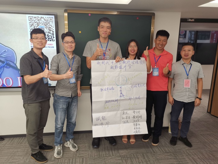 開班典禮結(jié)束后,由廖文博士帶領(lǐng)大家走進(jìn)“世界咖啡”這一分享智慧的工作坊,各小組發(fā)揮所長,聚焦小組目標(biāo),充分調(diào)動思維力、想象力,善用網(wǎng)絡(luò)、手機(jī)等資源,并集百家之長,成立了頗具特色的“勵劍十年”、“未來可期”、“回味”、“幸運(yùn)”、“賦能”咖啡廳,紛紛為小組設(shè)計(jì)出了一個個更為個性化的網(wǎng)絡(luò)研修方案。