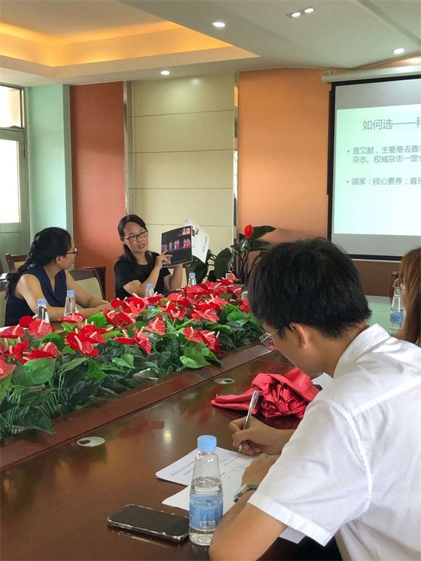首先,蔣校長(zhǎng)從課題的選題依據(jù)、研究框架、思路方法、創(chuàng)新之處等方面給音樂教研組成員作了生動(dòng)詳盡的介紹。在分享過程中,就課題命名的界定、關(guān)鍵詞的提取及分析方法的關(guān)聯(lián)性等問題,教研組成員與蔣校長(zhǎng)進(jìn)行了熱烈而深入的討論。