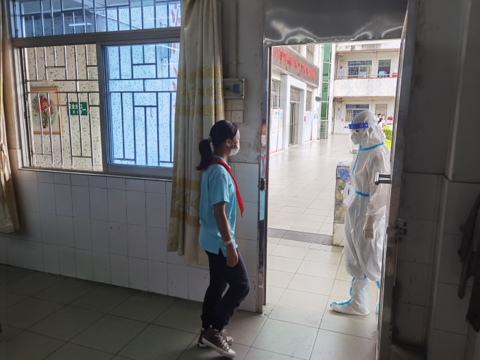 在本次演練活動中,以學(xué)校接到阜沙鎮(zhèn)疾控部門通知,張三同學(xué)為新冠肺炎密切接觸者,通報學(xué)校后進(jìn)行相關(guān)應(yīng)急處理為背景,共有模擬啟動應(yīng)急響應(yīng)、配合開展流行病學(xué)調(diào)查、組織人員核酸采樣、組織管控對象轉(zhuǎn)運(yùn)隔離、校園封閉封控后的管理五個的場景。在演練中牛角小學(xué)接到通知后,學(xué)校校醫(yī)立即穿戴防護(hù)服到密接學(xué)生班級,引領(lǐng)學(xué)生前往隔離室,并進(jìn)行流行病調(diào)查,同時醫(yī)療保障組封控管理該班師生。此時疫情防控工作領(lǐng)導(dǎo)小組成員到會議室召開緊急會議,各防控小組積極響應(yīng)、配合,成功完成演練。
