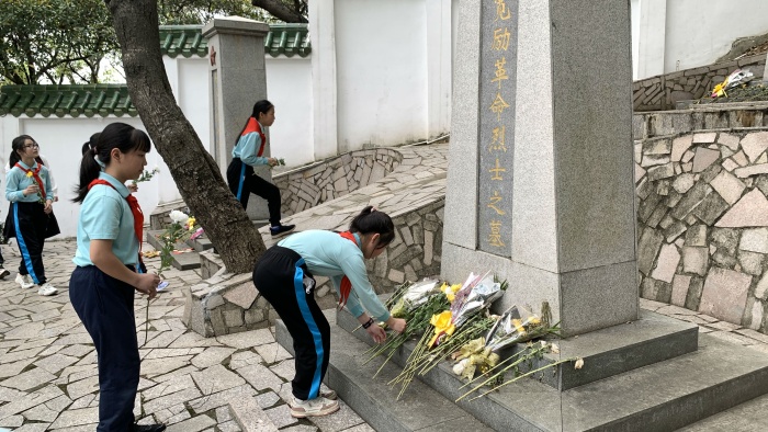 活動現(xiàn)場莊嚴肅穆。全體人員奏唱中華人民共和國國歌,接著少先隊員齊聲獻唱《我們是共產(chǎn)主義接班人》。師生們排列整齊,以嚴肅恭敬的心態(tài)寄托對革命烈士的追思。然后由黨員教師代表向革命烈士獻花圈,隊員們懷著崇敬的心情瞻仰烈士墓并敬獻手中的菊花。大隊輔導員梁老師為少先隊員介紹了烈士的英勇事跡,隊員們深受鼓舞。