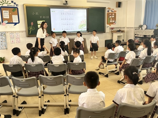 首先,調(diào)研組和語(yǔ)文科組的全體老師共同觀摩了一年級(jí)劉凱銀老師展示的課例《小池》。課上,劉老師運(yùn)用各種誦讀的方式,帶領(lǐng)學(xué)生感受古詩(shī)當(dāng)中的韻律之美,并通過圖文結(jié)合等方法感知古詩(shī)所描繪的夏日荷塘的和諧與情趣,讓學(xué)生多方位領(lǐng)略中華優(yōu)秀傳統(tǒng)文化吟誦的魅力。課堂上,劉老師還邀請(qǐng)了學(xué)校音樂老師為學(xué)生們進(jìn)行古箏伴奏,讓學(xué)生們?cè)谝魳分羞M(jìn)一步領(lǐng)略吟誦的美。課后,劉老師大方沉穩(wěn),有條不紊地說課,充分展示中山市實(shí)驗(yàn)小學(xué)教育集團(tuán)大豐小學(xué)青年教師的風(fēng)采。