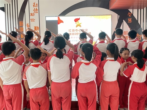隨后,六年級的老隊員們?yōu)槎昙壭玛爢T佩戴鮮艷的紅領(lǐng)巾,并互相敬隊禮,他們個個精神飽滿,臉上洋溢著自豪的笑容。在這一敬一回中,少先隊的精神被傳承下去,做到了“星星火炬,代代相傳”。在學(xué)校少工委副主任梁耀昌的帶領(lǐng)下,新老隊員在隊旗下莊嚴(yán)宣誓,整齊響亮的誓詞在大豐小學(xué)的校園上空回蕩著。