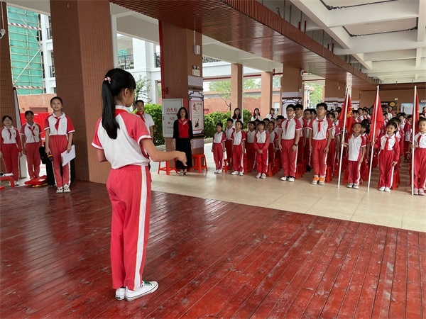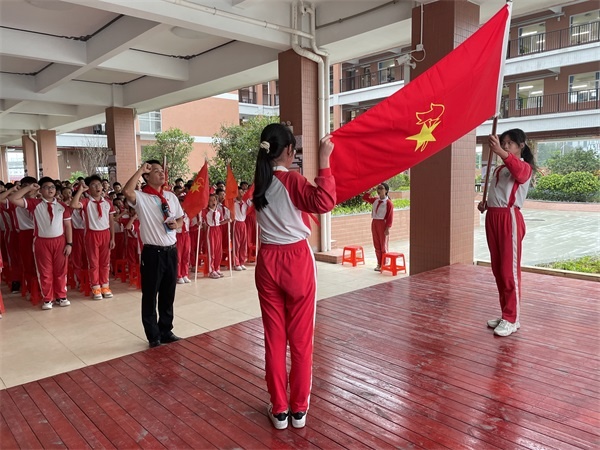 隨后,學(xué)校少先隊大隊長蘇翠兒同學(xué)上臺發(fā)言,她對新隊員們的加入表示衷心祝賀,同時希望少先隊員們都能夠在星星火炬的指引下,好好學(xué)習(xí)、好好鍛煉,用自己的實際行動為胸前的紅領(lǐng)巾增添光彩。在活動的尾聲,新老隊員們自豪地挺起胸膛、緊握拳頭,跟著張婉老師進行呼號,儀式最后,全體隊員敬禮,大隊旗手手握隊旗退場,本次少先隊入隊儀式圓滿結(jié)束。