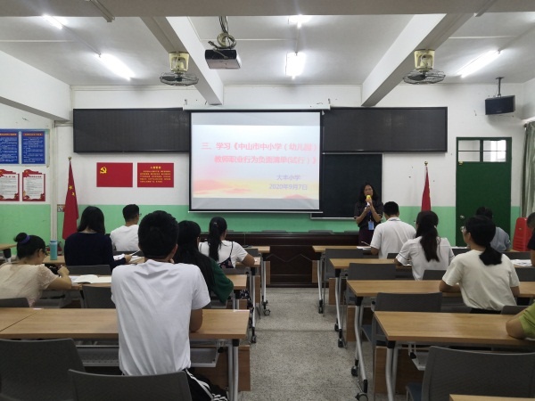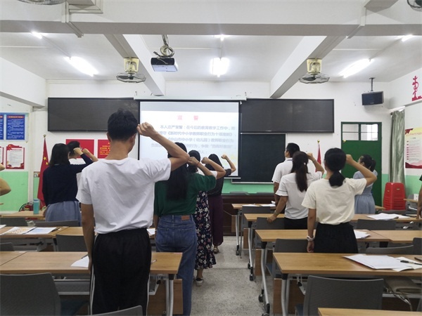 9月7日下午,2020年師德建設主題教育月啟動儀式在學校多媒體室舉行,全體教師參加了本次活動,活動由校長蘇少麗主持。在師德建設主題教育月啟動儀式上,蘇少麗校長傳達了《中山市教育和體育局關于開展2020年師德建設主題教育月活動的通知》的內(nèi)容,蘇校長對全體教師寄予厚望,希望全體教師堅持做到潛心問道、潛心育人,勉勵大家為人師表要高標準嚴要求,使得師德建設從外在約束成為一種內(nèi)在行動,進而轉(zhuǎn)化為教師個人的修行。隨后,全體教師還學習了《中山市中小學(幼兒園)教師職業(yè)行為負面清單(試行)》,簽訂了師德承諾書。在蘇少麗校長的帶領下,教師們還重溫了教師誓詞,錚錚誓言表達了老師們踐行師德承諾的堅定決心。