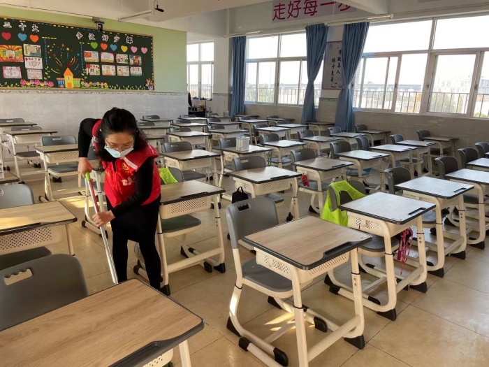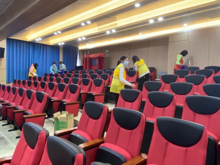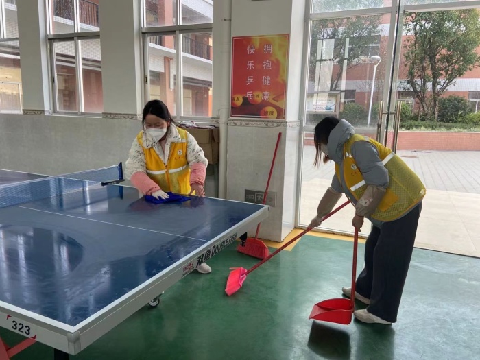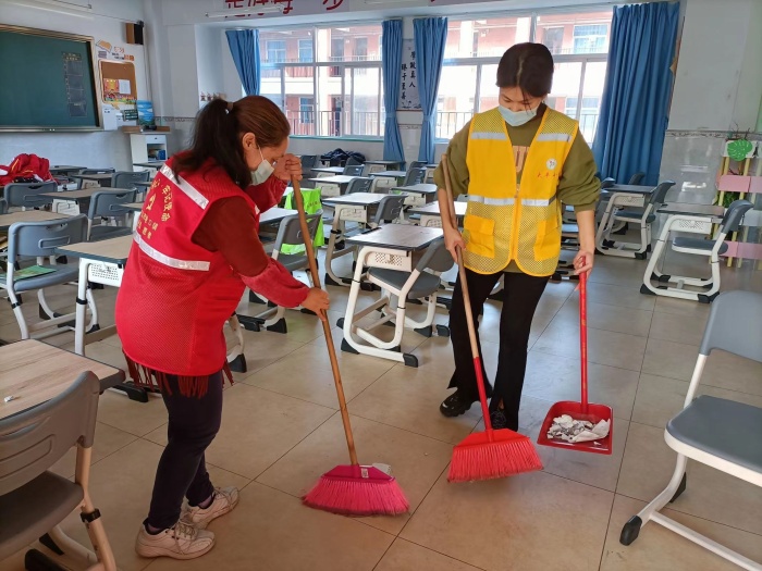 活動中,教師們身穿紅色和橙色的志愿者服裝,紛紛拿起掃帚、垃圾鏟、拖把、抹布等清潔工具,在小組長的帶領下到達相關室場。一到室場,教師們熱情高漲,積極投入各項衛(wèi)生清潔工作中。教師們不怕臟不怕累,不放過任何一個衛(wèi)生死角的清潔和消毒。校園里,到處可見紅色或者黃色的美麗身影,有的在報告廳打掃屏幕,有的在乒乓球室清理桌臺,還有的在圖書室整理各類書籍,教師們用辛勤勞動為共建美麗校園發(fā)光發(fā)熱,用自己的實際行動表達著對學校的熱愛,這也成為了大豐校園里一道紅橙相映的美麗風景。各活動室場的清潔結束后,班主任老師攜手副班主任老師,繼續(xù)回到自己的班級打掃教室衛(wèi)生。教室里,走廊外,隨處可見教師們勤勞的身影。他們互幫互助,齊心協(xié)力,忙碌著也快樂著,勞累著也幸福著......