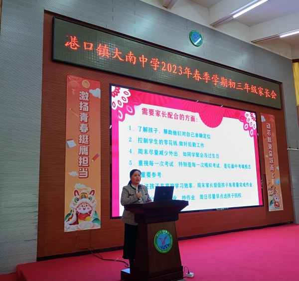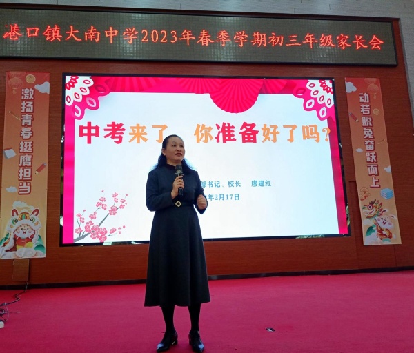 為加強(qiáng)家校聯(lián)系,形成教育合力,2023年2月17日下午,港口鎮(zhèn)大南中學(xué)邀請(qǐng)畢業(yè)班學(xué)生家長(zhǎng)齊聚校園,召開以“家校同心·師生同行”為主題的家庭教育培訓(xùn)暨畢業(yè)班家長(zhǎng)會(huì)。會(huì)議由德育處副主任孫欣欣主持。