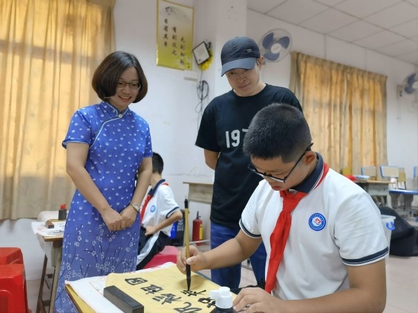 活動(dòng)現(xiàn)場(chǎng)氣氛熱烈,墨香濃郁,參會(huì)教師及學(xué)生在單老師的帶動(dòng)下,紛紛執(zhí)筆揮毫練習(xí)書(shū)法技巧,單老師走到大家身邊親切指導(dǎo)。大家以書(shū)法寄情懷,以書(shū)法弘揚(yáng)愛(ài)國(guó)精神,以筆墨傳承傳統(tǒng)文化,民主師生們用自己的獨(dú)特的方式向祖國(guó)媽媽獻(xiàn)禮!一幅幅作品詮釋著中華傳統(tǒng)文化的魅力,以清新高雅的丹青筆墨描繪著美好的新生活。