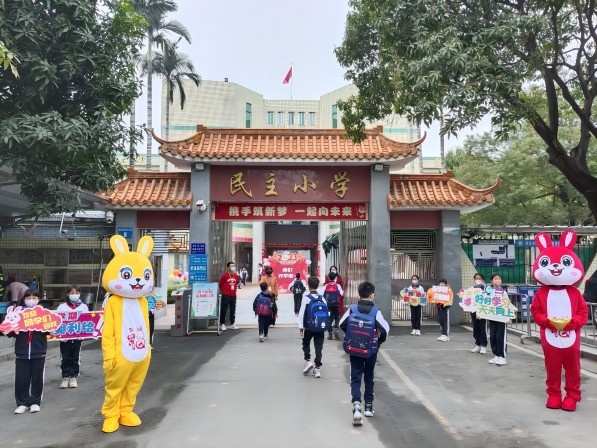 最是一年春好處,萬物之美始于此。清晨,遠(yuǎn)遠(yuǎn)就看到民主小學(xué)校門口校領(lǐng)導(dǎo)、一群穿戴著鮮艷的紅領(lǐng)巾的“小兔子們”正給每位入校的同學(xué)們發(fā)放開學(xué)紅包。領(lǐng)到紅包的孩子興奮不已,有的手舞足蹈,有的則迫不及待的打開看看里面藏著什么“神秘禮物”,一張張映紅了的笑臉在陽光下愈加燦爛。