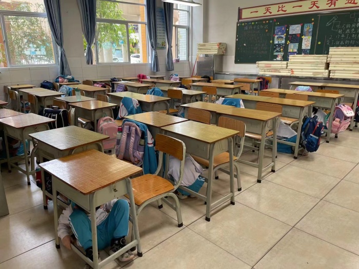 應(yīng)對地震的第一個(gè)演練項(xiàng)目是班級避險(xiǎn)措施。全體師生模擬地震來臨時(shí),在特殊無法疏散的情況下,快速躲避到課桌底下,用手護(hù)住后腦勺,保護(hù)頭部,臉朝下保證呼吸暢通。第二個(gè)演練場景是師生上語文課時(shí),聽到警報(bào)聲拉響,快速逃離到指定位置。警報(bào)聲響起,同學(xué)們拿書本擋住頭部,快速按班級分流,逃離到操場。整個(gè)演練過程緊湊有序,全體師生都能夠快速到達(dá)指定地點(diǎn)。隨后,各班班主任清點(diǎn)班級人數(shù)后匯報(bào)給杜佳明主任。