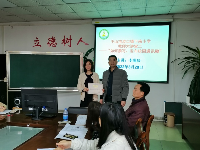 講座的尾聲,李老師為老師們講解了通訊稿的發(fā)布方法,同時(shí)還提點(diǎn)了不少的細(xì)節(jié)。最后由管德豐校長(zhǎng)為她頒發(fā)了證書,并作了講座總結(jié)。管校長(zhǎng)表示,通過此次活動(dòng),老師們對(duì)于通訊稿的撰寫有了全新的認(rèn)識(shí),對(duì)于寫作也有了新的思路與方向,相信學(xué)校今后必定會(huì)出現(xiàn)更多優(yōu)秀的通訊稿。