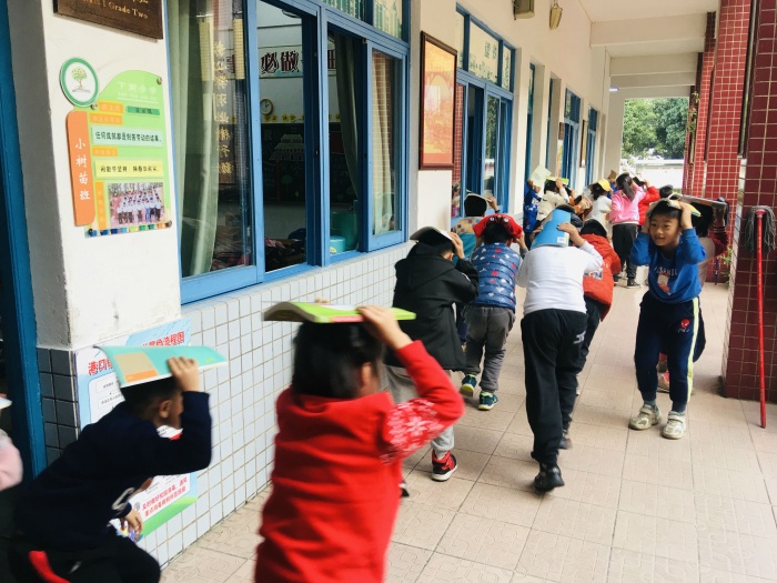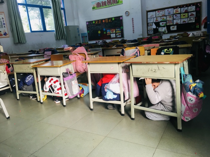 下午16點(diǎn)40分,廣播發(fā)出地震避險警報信號,意為此時感知地震等災(zāi)害發(fā)生,學(xué)生就地躲避,將身體縮成一團(tuán),用手護(hù)住頭和胸,躲在課桌底下,各教職工迅速到達(dá)各自崗位。