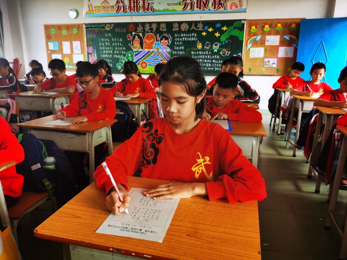 本次活動要求學(xué)生全員參與,比賽以各年級選定的古詩詞為書寫內(nèi)容,采取現(xiàn)場書寫形式。一、二年級用鉛筆,三至六年級用鋼筆(或圓珠筆)。比賽現(xiàn)場,參賽學(xué)生個(gè)個(gè)滿懷激情,用心書寫每一個(gè)筆畫、每一個(gè)漢字。同學(xué)們握筆正確,坐姿端正,表現(xiàn)出良好的書寫習(xí)慣,所寫作品筆畫流暢,橫平豎直,結(jié)構(gòu)勻稱,整體美觀,在短短的二十分鐘內(nèi)現(xiàn)場完成自己的作品。
